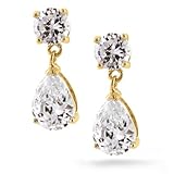 These gorgeous dangling earrings are a combination of solid .925 sterling silver and beautiful gold vermeil. A dazzling round-cut diamond CZ rests close to the ear in a 4-prong setting, while a larger pear-shaped diamond CZ dangles elegantly beneath it. A stud push-back closure emphasizes beauty and function. Perfect for brides, special occasions or a stylishly breathtaking accent to your evening wardrobe. Go ahead and wow them. You'll look amazing in the process. For pierced ears only.