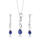 Earrings = Lab Created Sapphire, 2 pieces, Pear shape, 6x4mm. Earring Dimensions: 1 x 1/8 inches. Pendant = Lab Created Sapphire, 1 piece, Pear shape, 7x5mm. Pendant Dimensions: 1 1/8 x 1/8 inches. Earrings and Pendant have a total weight of 3.00 grams and are set in pure Sterling Silver with .925 stamp. Gemstones have a vibrant rich color and eye clean clarity. The Pendant and Earrings feature top quality workmanship and a beautiful finish. Includes Free 18 inch Sterling Silver Box Style Chain,