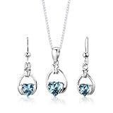 Earrings = Genuine Swiss Blue Topaz, 2 pieces, Heart shape, 5mm. Earring Dimensions: 1 x 3/8 inches. Pendant = Genuine Swiss Blue Topaz, 1 piece, Heart shape, 6mm. Pendant Dimensions: 3/4 x 3/8 inches. Earrings and Pendant have a total weight of 3.60 grams and are set in pure Sterling Silver with .925 stamp. Gemstones have a vibrant rich color and eye clean clarity. The Pendant and Earrings feature top quality workmanship and a beautiful finish. Includes Free 18 inch Sterling Silver Box Style Ch