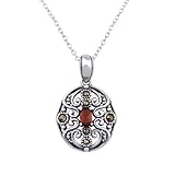 This magnificent Sterling Silver Garnet Pendant is fit for a queen. A faceted deep red garnet and six sparkling marcasite stones enhance the pretty scrolled cut-out design on a 925 sterling silver oval charm. An 18-inch cable chain with a spring-ring clasp holds this necklace at just the right place on your neck for standout style. Pair this pendant with a dramatic velvet cocktail dress to make a regal entrance at your next special event.